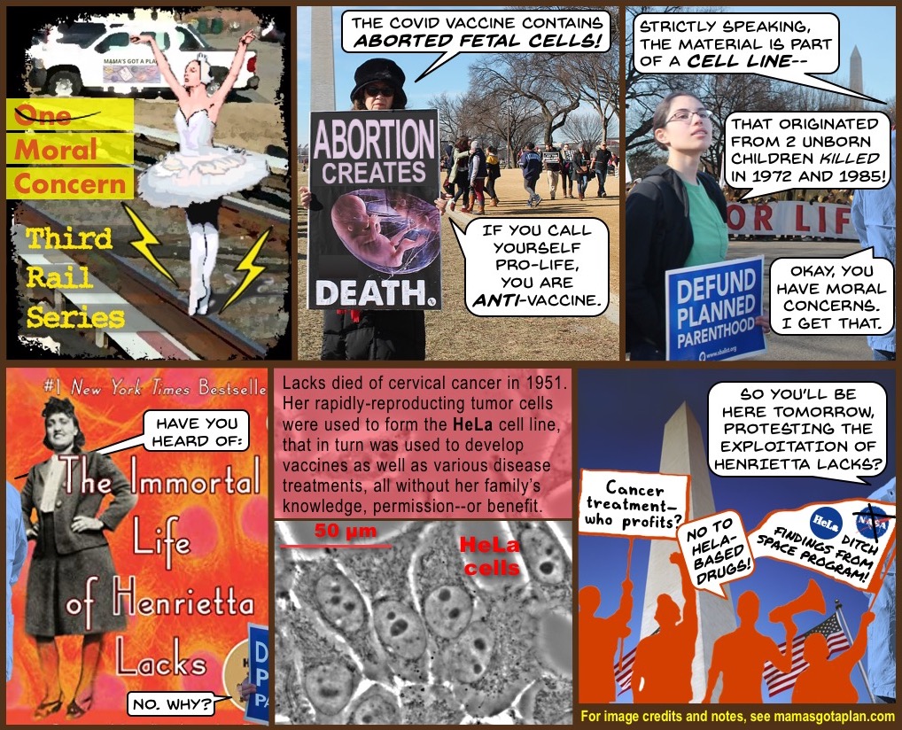 Some people with concerns about the safety or efficacy of vaccines object to the presence of “aborted fetal cells” in vaccines. However easy (and gruesome!) it is to picture a dismembered hand pushing up through a syringe’s liquid, that is not the reality. As the blue-jacketed person in Frame 3 tries to point out, what is in question are cell lines. How are cell lines formed? Scientists use cells taken from