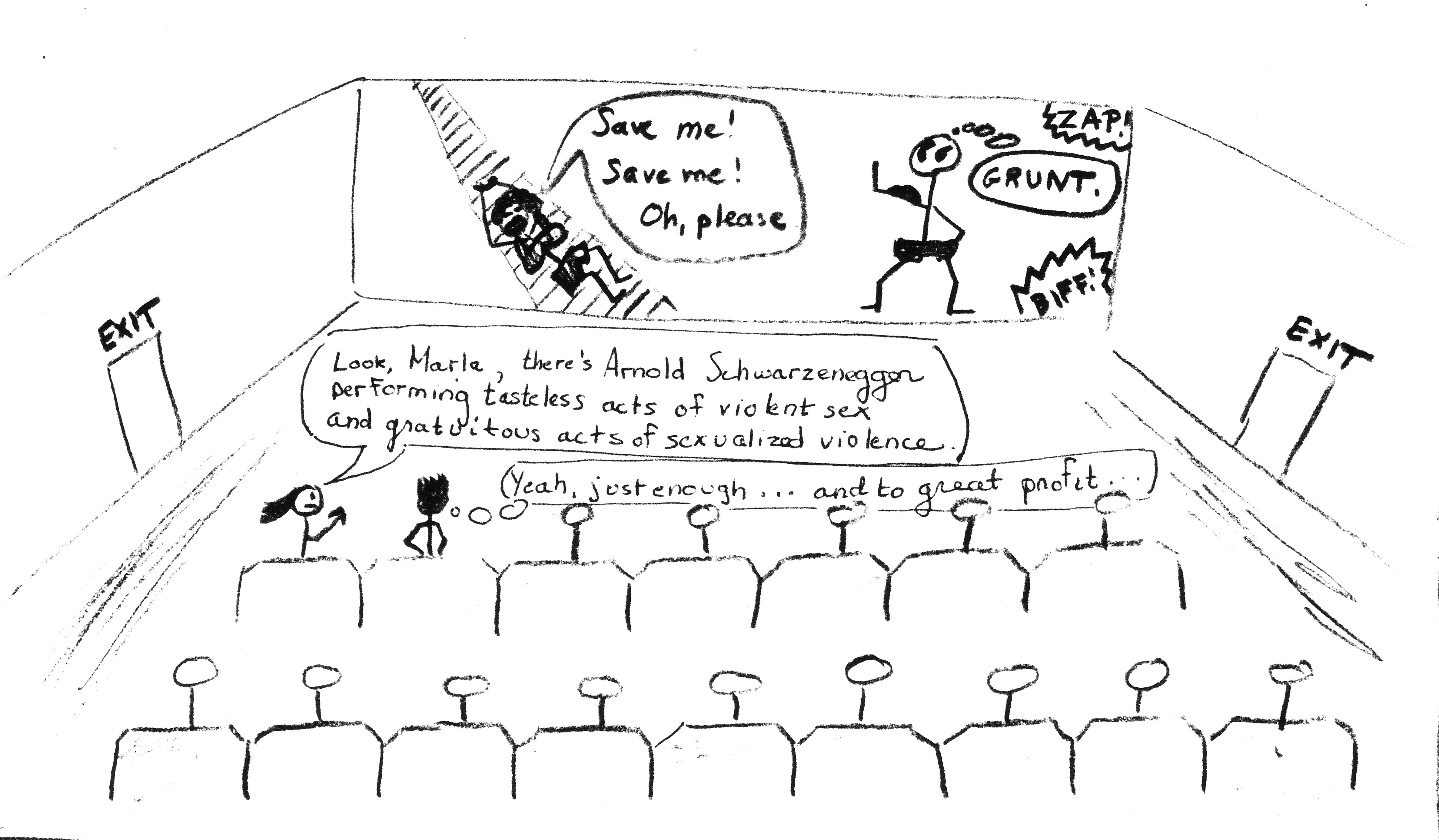 In the early 1990s, the video rental industry flourished. Nevertheless, as is shown here, people still went to the movies.