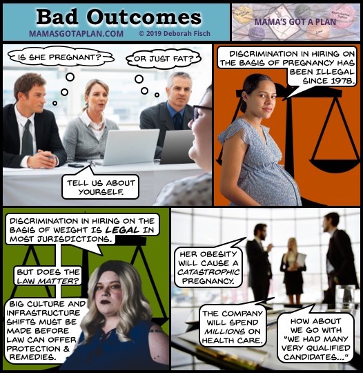 1We usually use the phrase “pregnant people” or “birthing people.” However, because the topic of this cartoon is extremely gendered, we will refer to “women,” with the understanding that pregnant people who do not identify as women face additional problems beyond the scope of this post. 2The accepted medical term these days seems to be people who “have obesity.” We use “fat” as the term preferred by the fat acceptance movement. 3Obviously, the structure of the U.S. health care payor system is a key culprit in employers’ general fears about health care costs. This post is not trying to solve that problem. One thing at a time, okay?