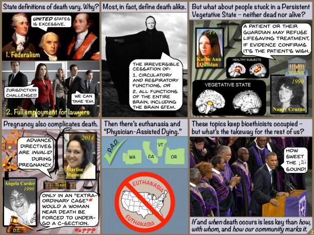Therefore, although this cartoon begins with an attempt to establish the elusive line between life and death, it goes on to comment on the nature of state law on the matter, the difficult cases of dead-but-not-really-dead people, the impact of pregnancy on dying, and a look at what happens when patients want to die.